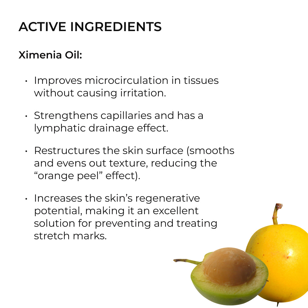 Prețiosul ulei de ximenia din compoziție luptă eficient împotriva aspectului de coajă de portocală și vergeturilor, stimulând arderea țesutului adipos. Toxinele, reziduurile și excesul de lichid, eliminate în timpul procedurii la suprafața pielii, sunt absorbite de împachetări.