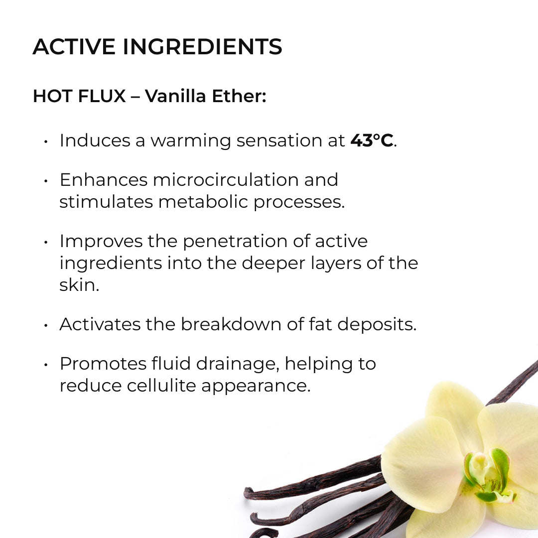HOT FLUX (component de încălzire) – este un eter de vanilie obținut printr-o metodă unică. Acest eter acționează asupra receptorilor nervoși, provocând o senzație de încălzire de până la 43°C. Influențează cheratinocitele epidermice, celulele Langerhans, glandele sudoripare și celulele netede, ceea ce crește imunitatea pielii și stimulează procesele regenerative.