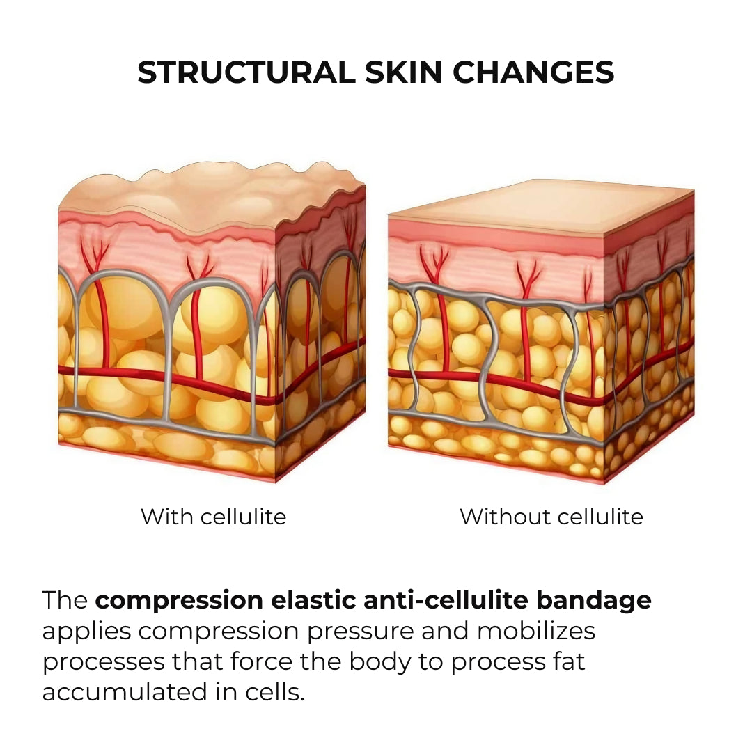 - Prin sinergia dintre compresie și acțiunea lichidului anticelulitic, îmbunătățește drenajul limfatic, reduce volumul corporal și uniformizează suprafața pielii, eliminând aspectul de coajă de portocală.
