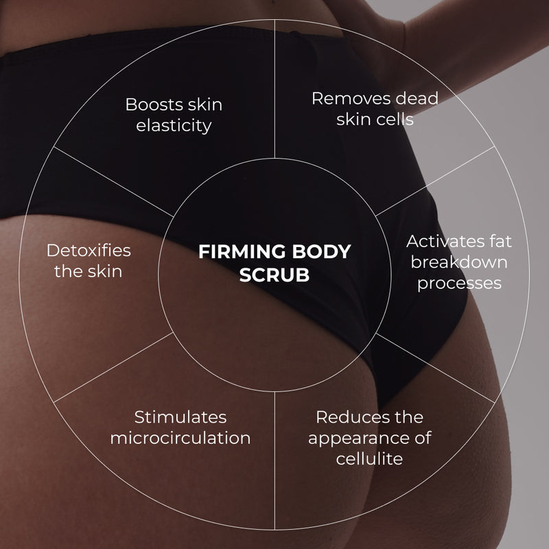 Uleiul de migdale și uleiul din semințe de struguri asigură o hidratare profundă și contribuie la menținerea elasticității pielii. Acest scrub reduce eficient aspectul vizibil al celulitei și îmbunătățește textura și aspectul general al pielii.