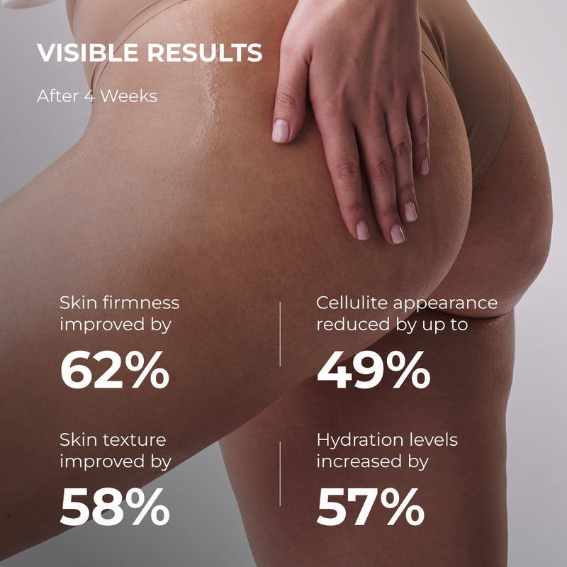 După 4 săptămâni, elasticitatea pielii a crescut cu 61%, ceea ce indică o îmbunătățire semnificativă a elasticității acesteia. Textura pielii s-a îmbunătățit cu 56%, ceea ce permite pielii să arate mai uniformă și mai netedă. Manifestările celulitei au scăzut cu 53%, ceea ce reprezintă o realizare semnificativă în lupta împotriva acesteia. Nivelul de hidratare a pielii a crescut cu 69%, asigurând catifelare și confort.