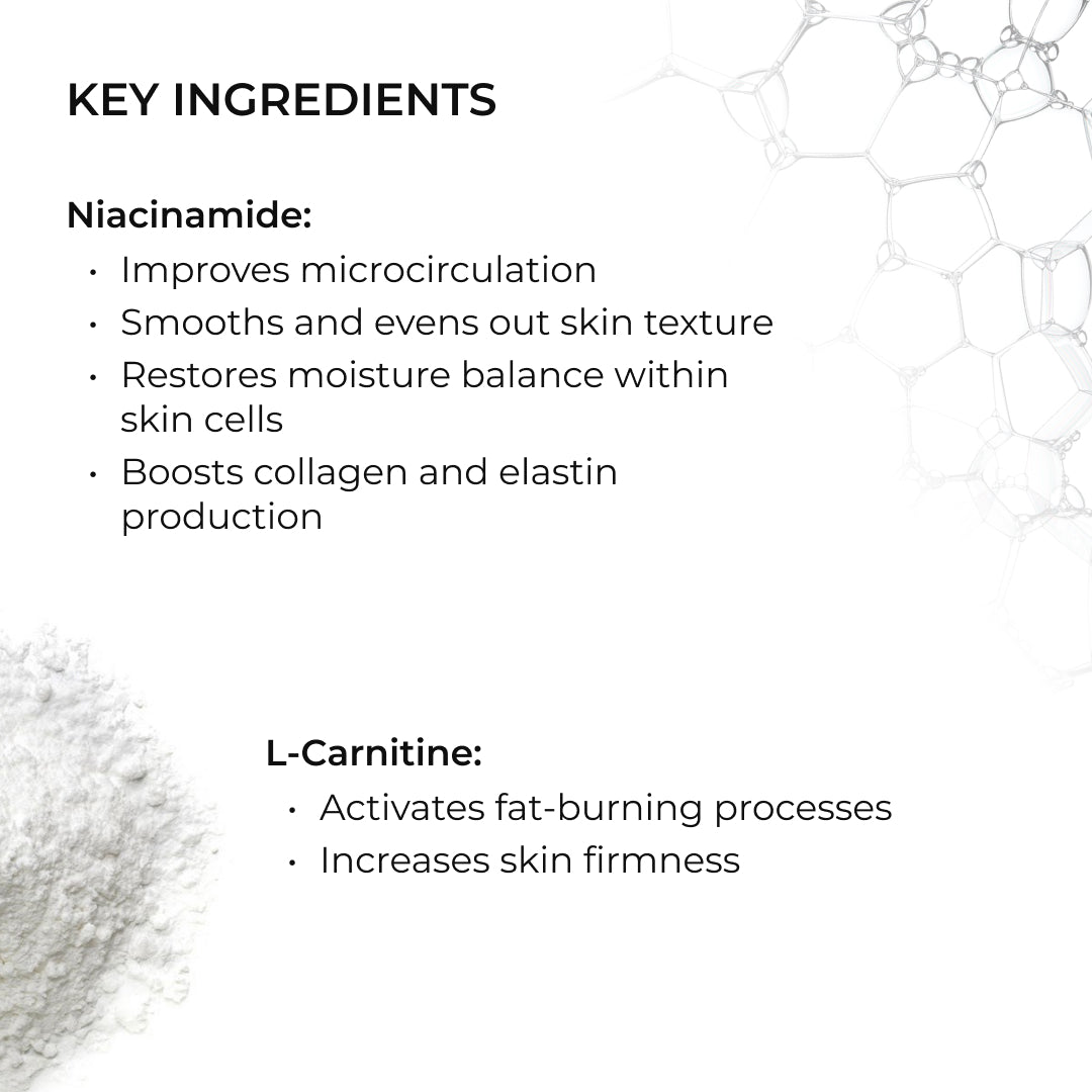 Niacinamida contribuie la îmbunătățirea microcirculației, ajută la uniformizarea reliefului pielii și reduce fenomenele de congestie în țesuturi. De asemenea, contribuie la regenerarea pielii, reducând semnele de oboseală și stres. L-carnitinul contribuie activ la procesele de ardere a depozitelor de grăsime, ajutând la reducerea manifestărilor celulitei. De asemenea, crește elasticitatea pielii, făcând-o mai elastică și mai fermă.
