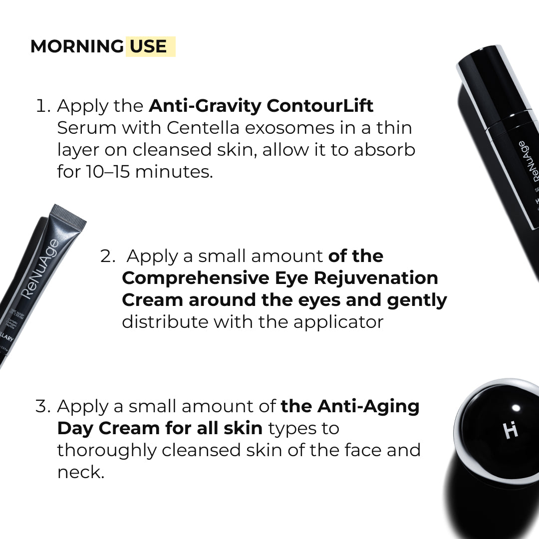 Setul de produse anti-îmbătrânire Hillary ReNuAge oferă o abordare complexă a îngrijirii pielii, asigurând un efect vizibil de întinerire. Combinația de produse ReNuAge asigură un efect sinergic, în care componentele active se potențează reciproc, oferind pielii îngrijire și protecție maxime. Utilizarea complexă a produselor permite obținerea de rezultate mai rapide și mai durabile în combaterea semnelor de îmbătrânire.