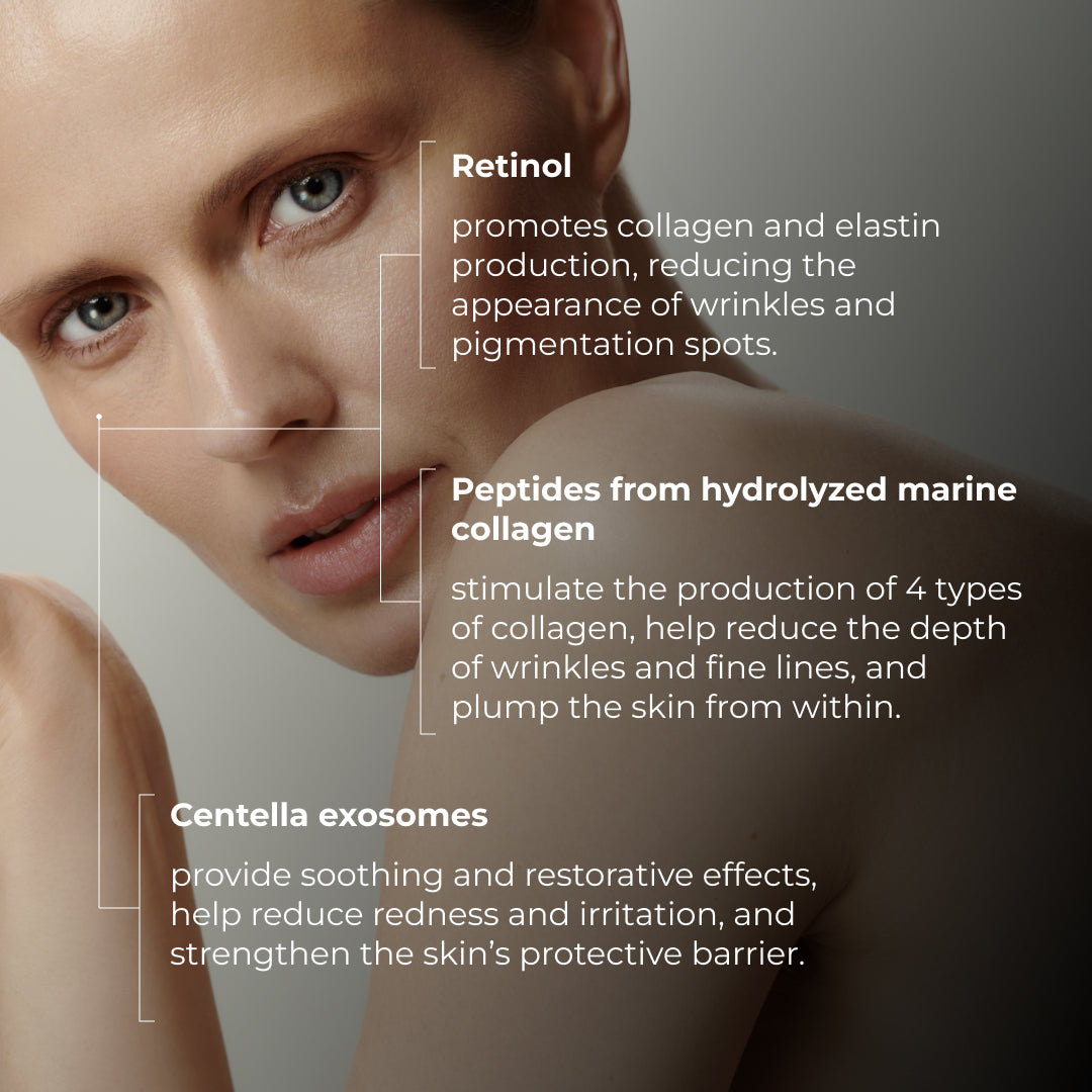 Complexul Hillary ReNuAge combină ingrediente puternice anti-îmbătrânire, care acționează sinergic pentru regenerarea profundă, întinerirea și hidratarea pielii. Retinolul stimulează regenerarea celulară, reducând ridurile și pigmentarea, iar niacinamida uniformizează tonul și întărește funcțiile de barieră. Peptidele de colagen marin și Hexapeptide-9 activează sinteza colagenului propriu, sporind elasticitatea pielii, în timp ce extractul de bulgăre de crocus îmbunătățește comunicarea celulară, întărind derma. Acidul hialuronic asigură o hidratare de lungă durată, iar guma hidrolizată Sclerotium creează o barieră protectoare, prevenind pierderea umidității. Datorită combinației acestor componente, Hillary ReNuAge nu doar maschează semnele îmbătrânirii, ci acționează la nivel celular, declanșând mecanismele de întinerire naturală a pielii.