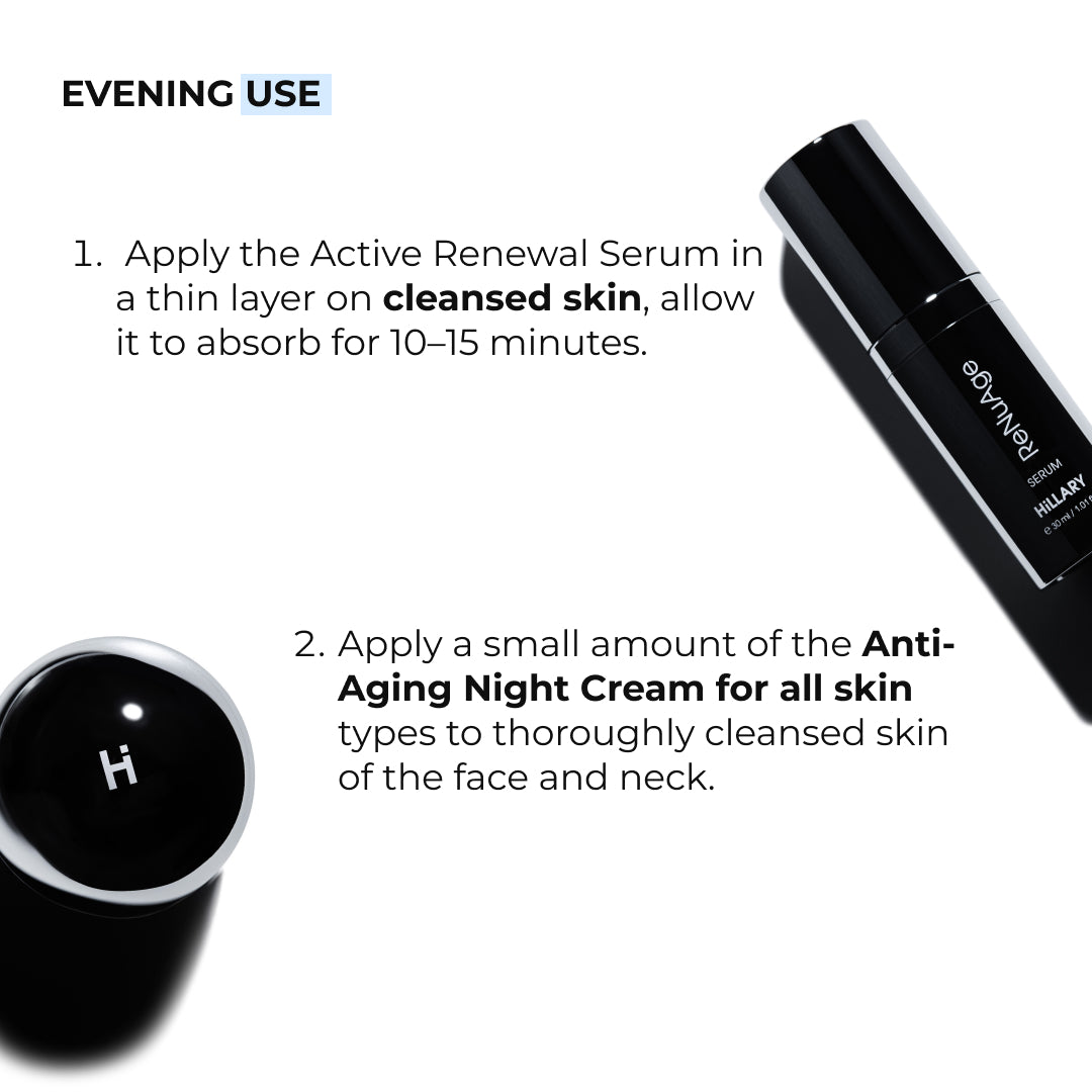 Abordarea complexă Hillary ReNuAge asigură regenerarea și întinerirea treptată a pielii, deoarece fiecare produs îndeplinește funcția sa. Serumul cu retinol activează reînnoirea celulelor și stimulează producția de colagen. Serul antigravitațional modelează conturul feței, asigurând un efect de lifting. Crema de zi menține hidratarea și protejează împotriva factorilor de mediu. Crema de noapte activează regenerarea intensivă a pielii în timpul somnului. Crema pentru zona din jurul ochilor ajută la reducerea cearcănelor și a umflăturilor, precum și la prevenirea apariției ridurilor.