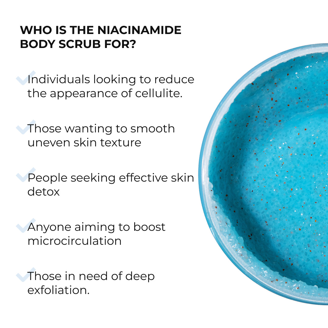 - Scrub modelator pentru corp cu Niacinamidă. Aplicați pe pielea curată și umedă a zonelor cu probleme, cu mișcări ușoare de masaj. Masați timp de 5 minute. Clătiți cu apă caldă, fără săpun. Pentru un efect de durată, utilizați de 2 ori pe săptămână.