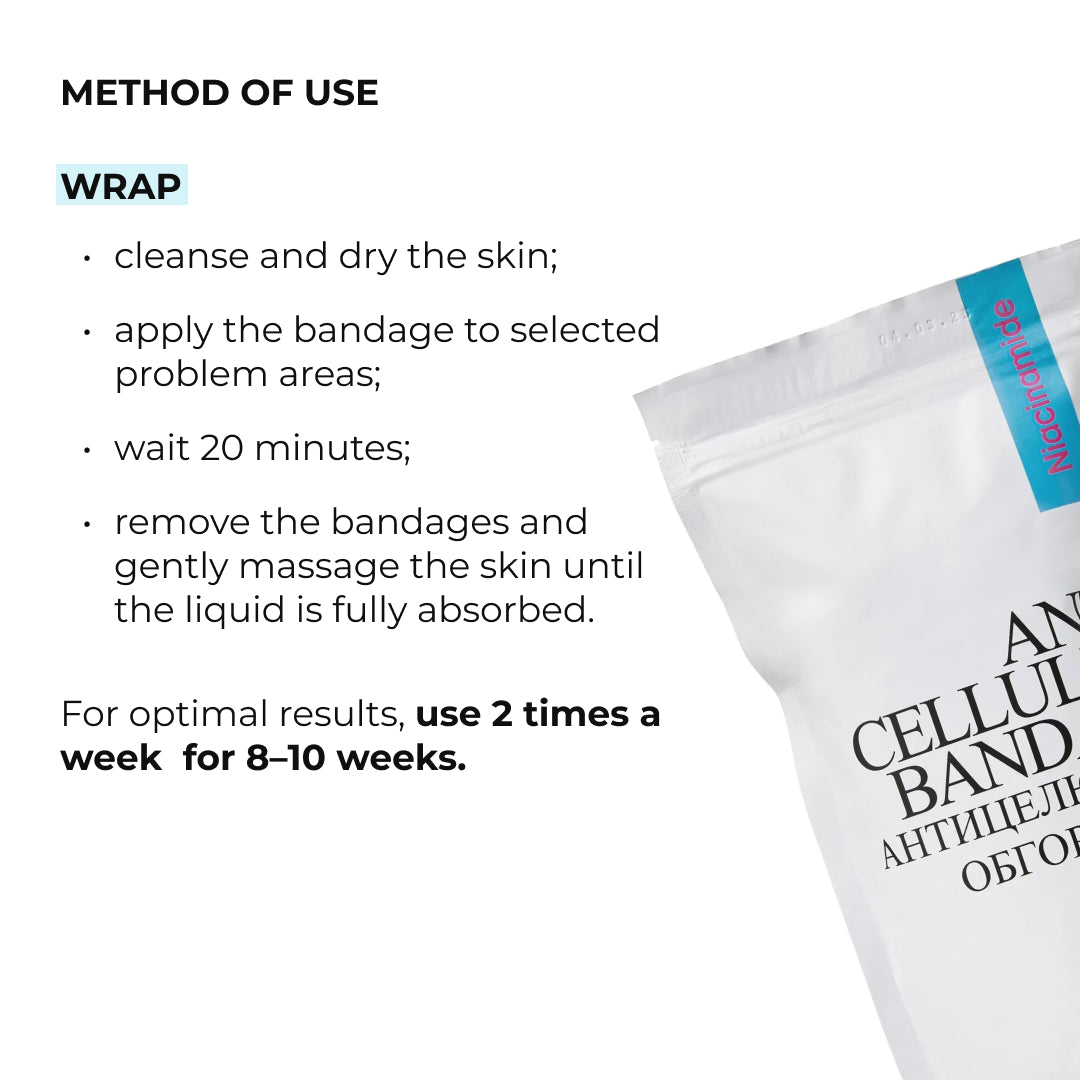 1. Împachetări modelante anticelulitice pentru corp cu niacinamidă. Aplicați bandajul pe zonele problematice selectate ale pielii curate și uscate. Așteptați 20 de minute. Îndepărtați bandajele și masați ușor pielea pentru a absorbi complet lichidul.