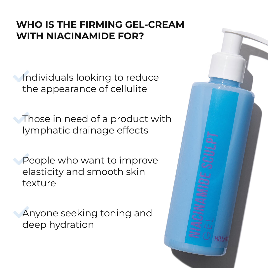 Îngrijirea corporală complexă cu niacinamidă contribuie la combaterea activă a celulitei, la uniformizarea reliefului pielii și la creșterea elasticității acesteia.