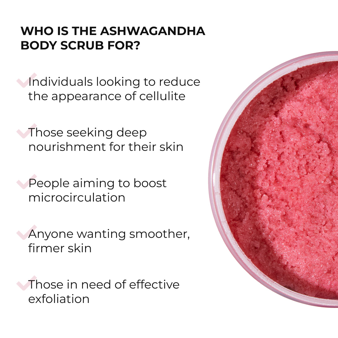 - Scrub corporal roz, catifelat, cu extract de Ashwagandha. Aplicați pe pielea curată și umedă a zonelor cu probleme, cu mișcări ușoare de masaj. Masați timp de 5 minute. Clătiți cu apă caldă, fără săpun. Pentru un efect de durată, utilizați de 2 ori pe săptămână.