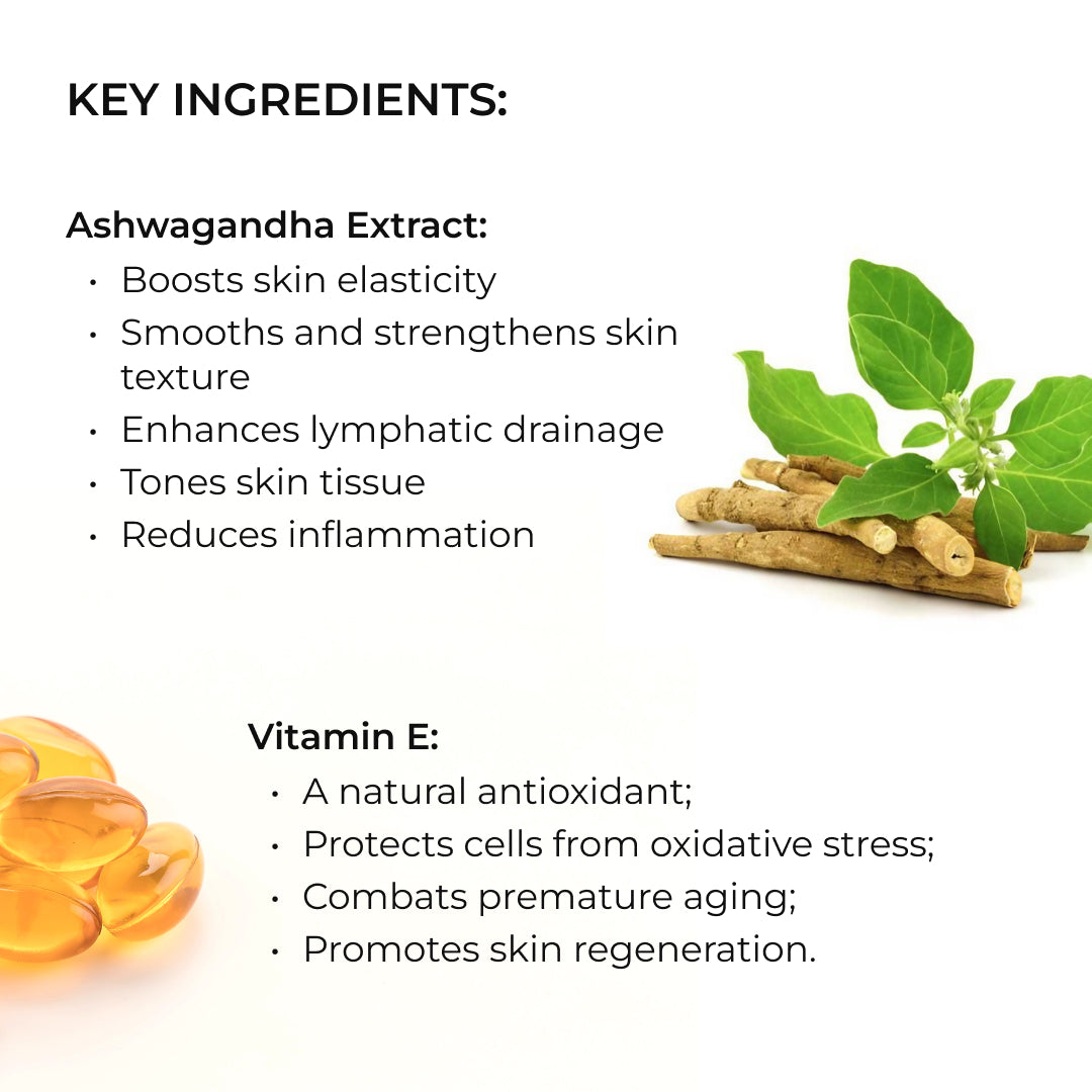- Gel-cremă pentru tonus și elasticitate a pielii cu extract de Ashwagandha. Aplicați pe pielea curată a zonelor cu probleme, cu mișcări ușoare de masaj. Lăsați să se absoarbă timp de 10–15 minute. Pentru un efect durabil, se poate utiliza zilnic.