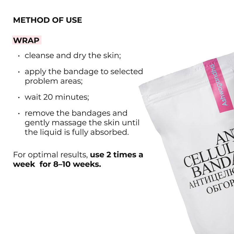 1. Împachetări modelatoare anticelulitice pentru corp cu extract de ashwagandha. Aplicați bandajul pe zonele problematice ale pielii curate și uscate. Lăsați să acționeze timp de 20 de minute. Îndepărtați bandajele și masați ușor pielea pentru a favoriza absorbția completă a lichidului..