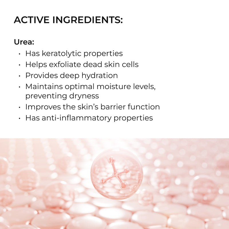 Ureea are proprietăți hidratante și keratolitice. Nu doar că ajută la exfolierea celulelor moarte, dar și menține un nivel optim de hidratare, prevenind uscarea pielii — aspect esențial în cazul keratozei.