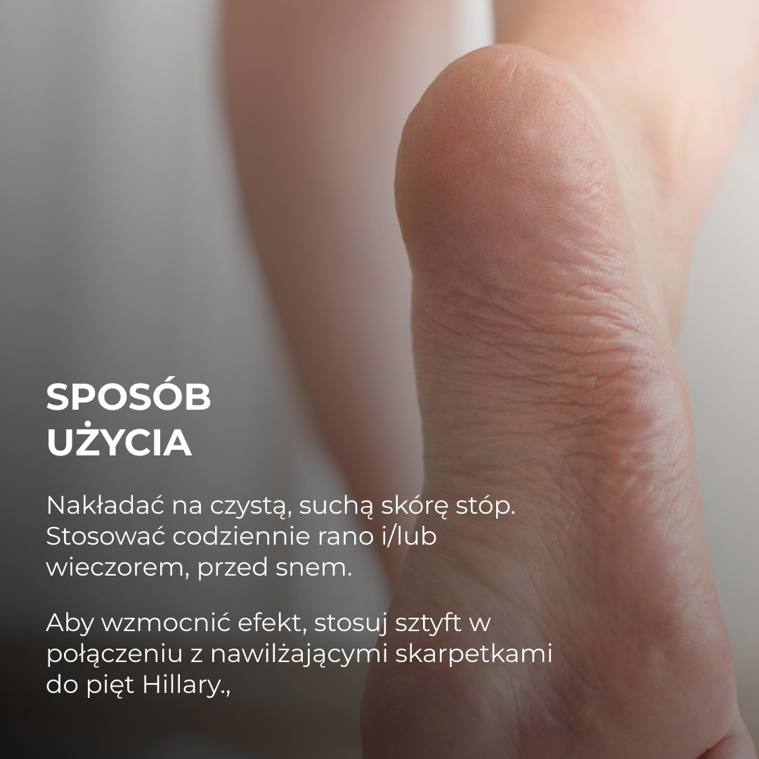 Pentru intensificarea efectului și îngrijire la nivel de salon, folosește stick-ul împreună cu Șosetele pentru călcâie Hillary Repair HydraHeel Comfort Socks.
