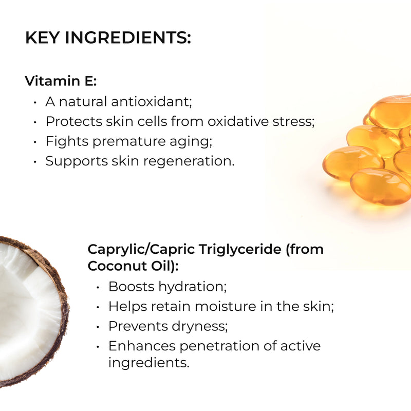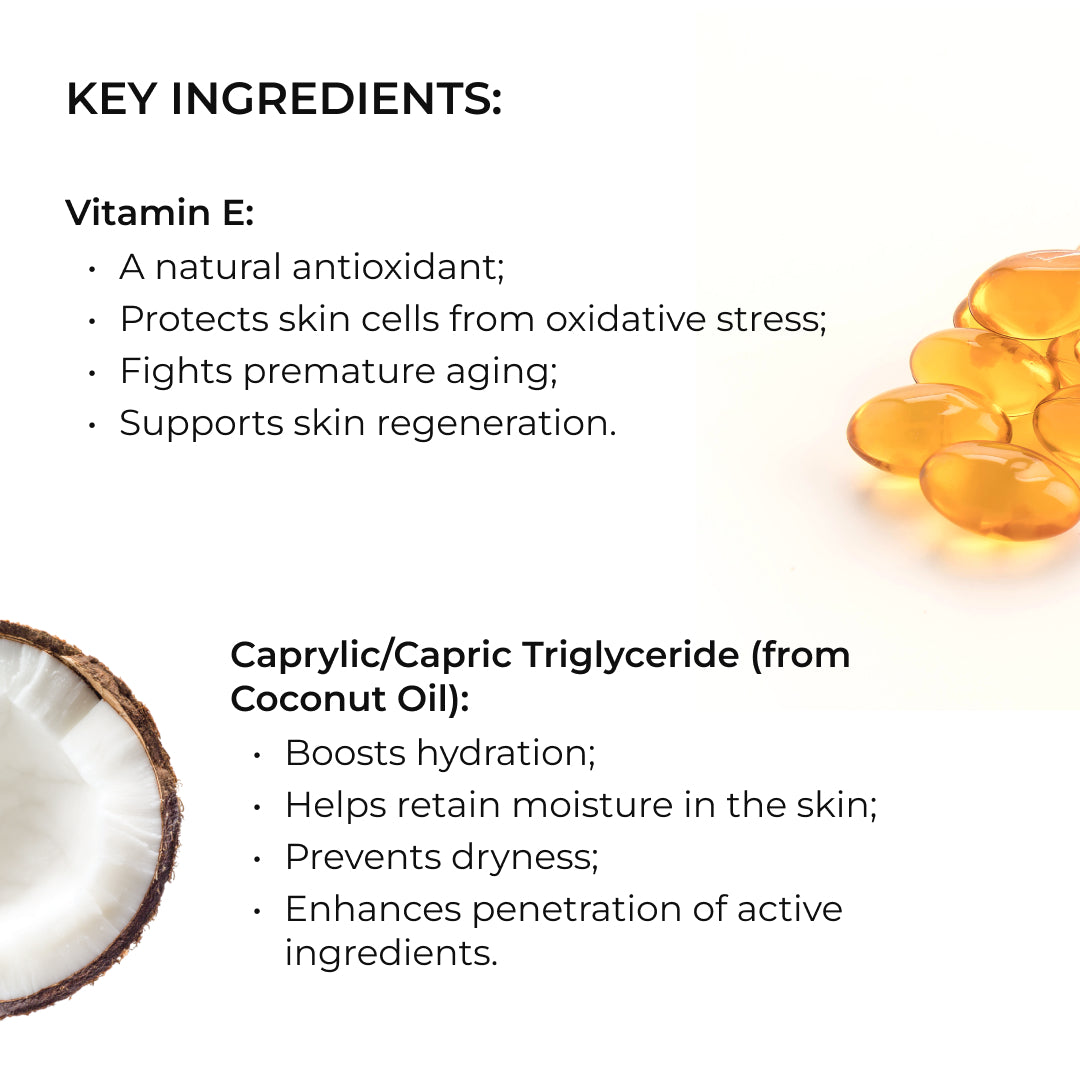 Vitamina E – antioxidant natural care protejează celulele de stresul oxidativ, combate îmbătrânirea prematură și favorizează regenerarea pielii. Trigliceridele caprilice hidratează delicat pielea, îmbunătățind textura acesteia.