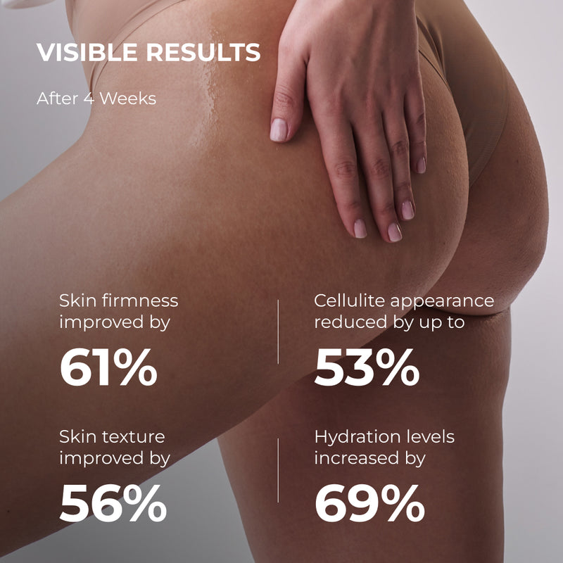 După 4 săptămâni, elasticitatea pielii a crescut cu 61%, ceea ce indică o îmbunătățire semnificativă a elasticității acesteia. Relieful pielii s-a îmbunătățit cu 56%, ceea ce a contribuit la uniformizarea și netezirea acesteia. Manifestările celulitei s-au redus cu 53%, ceea ce confirmă eficacitatea produsului în combaterea acesteia. În plus, nivelul de hidratare a pielii a crescut cu 69%, asigurând o senzație de catifelare și confort.