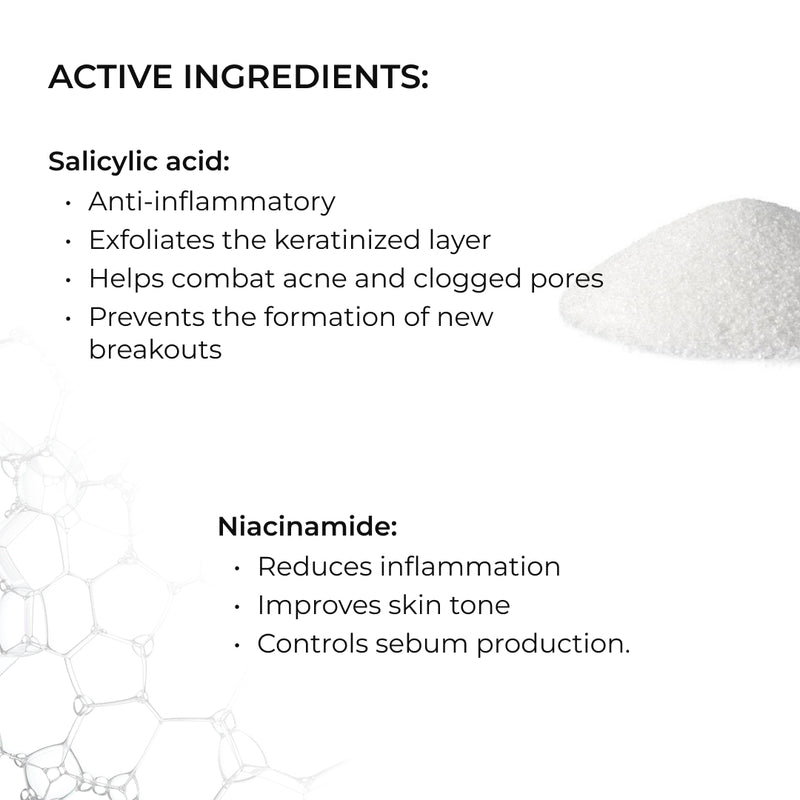 Acidul salicilic (BHA) pătrunde adânc în pori, exfoliază stratul keratinizat și ajută la combaterea acneei și a porilor înfundați. Niacinamida reduce inflamația, îmbunătățește tonusul pielii și controlează producția de sebum.