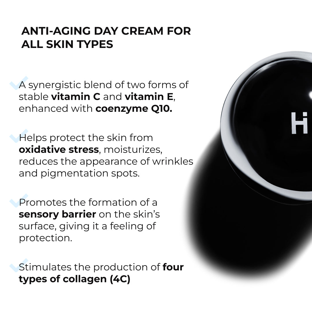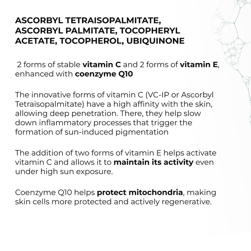Formula activă a cremei de zi asigură hidratarea rapidă și întărirea oferindu-i o senzație de protecție pe tot parcursul zilei. Amestecul sinergic al celor două forme de vitamina C stabilă și vitamina E, care întărește coenzima Q10, îmbunătățește protecția pielii împotriva stresului oxidativ, hidratează, reduce apariția ridurilor și a petelor pigmentare, menținând sănătatea și tinerețea pielii.
