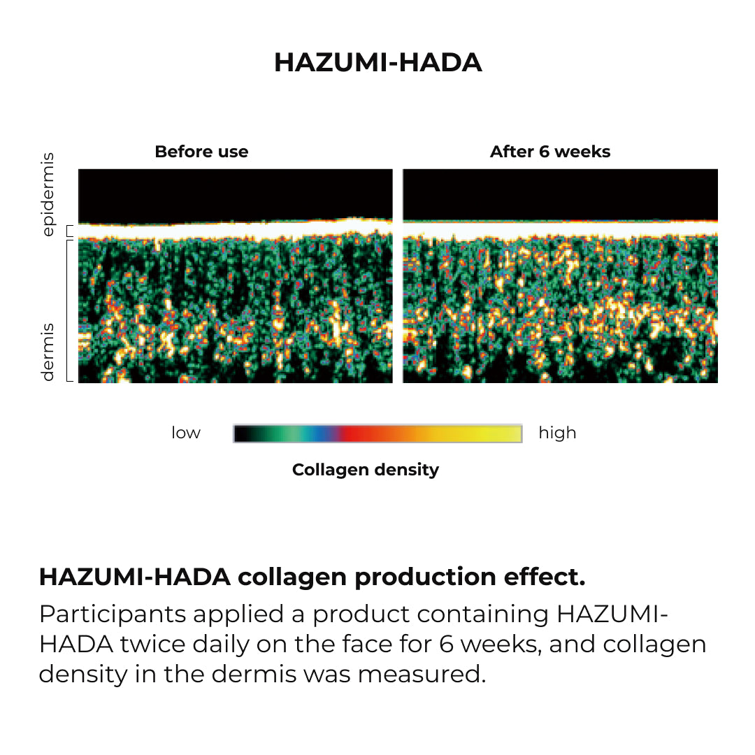 Hidratează instantaneu și formează o barieră senzorială la suprafață, oferind o senzație de protecție și hidratare. În același timp, această formă favorizează producerea de molecule semnalizatoare care îmbunătățesc activitatea fibroblastelor, celulelor, pentru producerea de colagen în piele. O altă funcție a Hazumi Hada este efectul sinergic cu vitamina C , pentru a spori eficacitatea acțiunii sale.
