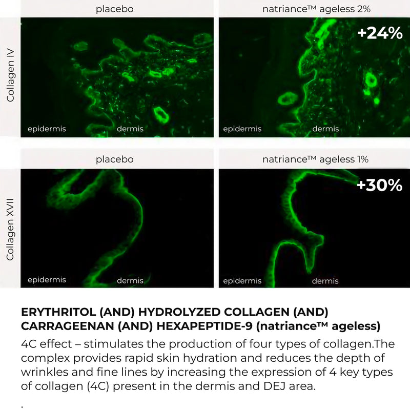 4C – efect, stimulează producția a patru tipuri de colagen. Complexul asigură hidratarea rapidă a pielii și reduce adâncimea ridurilor și a liniilor fine, crescând expresia a 4 tipuri cheie de colagen (4C), prezent în derm și zona DEJ. Acest lucru a permis, după doar 28 de zile de utilizare, reducerea semnificativă a suprafeței „laba de gâscă” (poate de 2 ori) și „umplerea” acesteia, reducând adâncimea ridurilor.